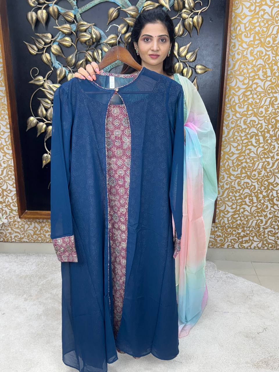 TOP : Printed Cotton (sleeve Inside )OVER COAT : Georgette With Hand Aari Work Read more
