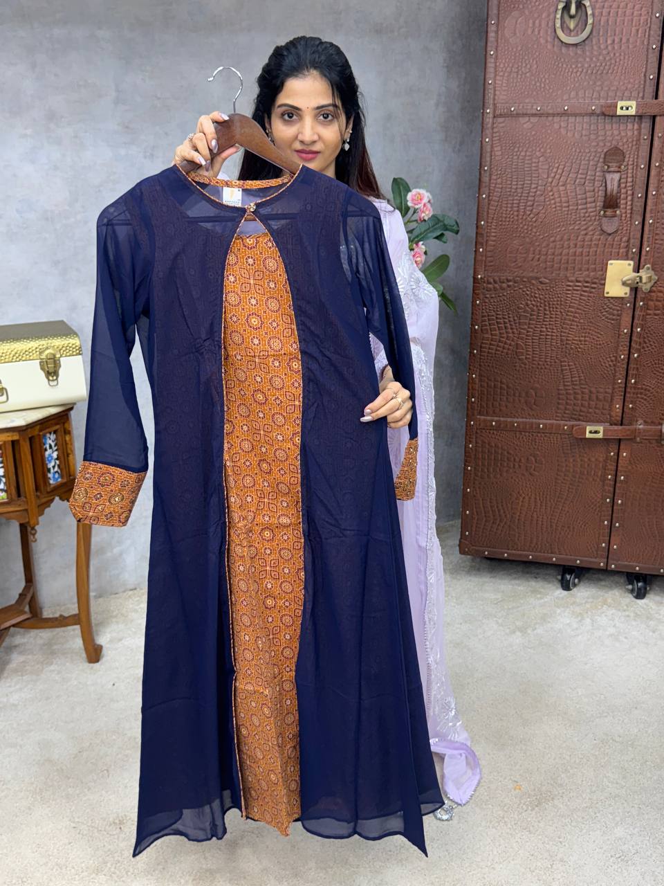 TOP : Printed Cotton (sleeve Inside )OVER COAT : Georgette With Hand Aari Work Read more